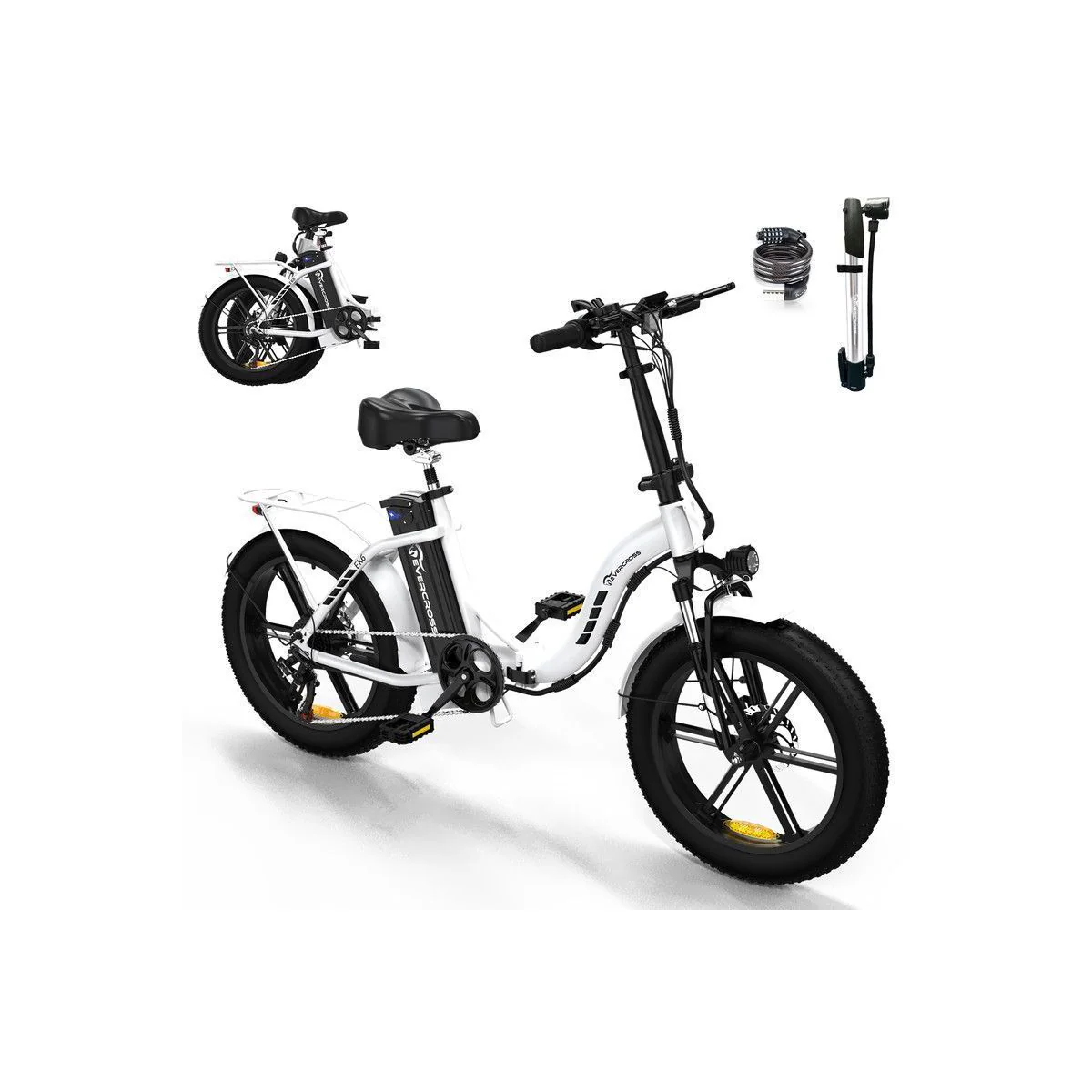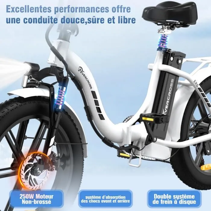 A Bluhan EK6 é uma bicicleta elétrica dobrável do tipo fat bike, projetada para oferecer conforto, estabilidade e versatilidade em todos os tipos de terreno. Ela possui pneus largos de 20” x 4.0 resistentes a furos e um sistema de dupla suspensão (garfo dianteiro e canote) que garante uma pedalada suave na cidade, na neve, na praia ou em trilhas de montanha.